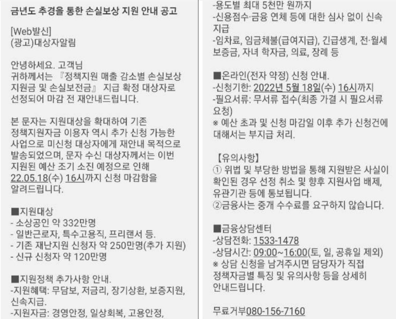 소상공인 손실보상, 손실보전금 사기문자 전화주의 요망